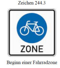 Ge- oder Verbot 1. Anderer Fahrzeugverkehr als Radverkehr sowie Elektrokleinstfahrzeuge im Sinne der eKFV dürfen Fahrradzonen nicht benutzen, es sei denn, dies ist durch Zusatzzeichen erlaubt. 2. Für den Fahrverkehr gilt eine Höchstgeschwindigkeit von 30 km/h. Der Radverkehr darf weder gefährdet noch behindert werden. Wenn nötig, muss der Kraftfahrzeugverkehr die Geschwindigkeit weiter verringern. 3. Das Nebeneinanderfahren mit Fahrrädern ist erlaubt. 4. Im Übrigen gelten die Vorschriften über die Fahrbahnbenutzung und über die VorfahrtAnmerkungen:Die Regelung ermöglicht den Straßenverkehrsbehörden, Fahrradzonen anzuordnen. Fahrradzonen stellen eine flächenmäßige Erweiterung der nur streckenmäßig anzuordnenden Fahrradstraßen dar und sollen der Sicherheit und Leichtigkeit des Radverkehrs dienen.Hinsichtlich der konkreten Anordnungsvoraussetzungen orientiert sich die Regelung an den für die Anordnung von Tempo 30-Zonen geltenden Bestimmungen. Infolge der Abkehr von der generellen Innerortshöchstgeschwindigkeit kann es sich nur um Straßen handeln, die nicht Teil des Hauptverkehrsstraßennetzes sind, auf denen ca. 2/3 des innerörtlichen Verkehrs abgewickelt werden und bei denen es sich infolge ihrer Verkehrsfunktion zur Abwicklung des überörtlichen Verkehrs um klassifizierte Straßen oder wesentliche innerörtliche Verbindungsstraßen handelt. Wegen des fehlenden Sichtbarkeitsprinzips ist zur Verdeutlichung des Zonen-bewusstseins innerhalb der Fahrradzone in regelmäßigen Abständen das Zeichen 244.3 als Sinnbild auf der Fahrbahn aufzubringen. (dies wird voraussichtlich in der neuen VwV-StVO geregelt).Fahrradzonen dürfen sich nicht mit Tempo-30-Zonen überschneiden. Durch die ihnen zugedachte Wirkung zur Verkehrsberuhigung sowie zur Förderung des Radverkehrs werden die Anordnungsvoraussetzungen für Fahrradzonen denen von Tempo-30-Zonen gleichgestellt.Es ist damit zu erwarten, dass sie die künftige städtebauliche Entwicklung beeinflussen.Wann Fahrradzone ?Meine Empfehlung:Die Anordnung einer Fahrradzone kommt nur auf Straßen mit einer hohen oder zu erwartenden hohen Fahrradverkehrsdichte oder auf Straßen von lediglich untergeordneterBedeutung für den Kraftfahrzeugverkehr in Betracht.Eine hohe Fahrradverkehrsdichte setzt nicht voraus, dass der Radverkehr die vorherrschende Verkehrsart ist.Anderer Fahrverkehr als der Radverkehr oder der Verkehrs mit Elektrokleinstfahrzeugen sollte nur ausnahmsweise durch die Anordnung entsprechender Zusatzzeichen zugelassen werden.Vor der Anordnung einer Fahrradzone müssen die Bedürfnisse des Kraftfahrzeugverkehrs ausreichend berücksichtigt werden, z.B. durch eine alternative Verkehrsführung.Auch wenn es sicherlich Begehrlichkeiten geben wird, umfassend Fahrradzonen einzurichten, so rate ich von einer deratigen Vorgehensweise ab. Die Umrüstung kompletter Tempo-30-Zonen in Fahrradzonen wird allein schon von der Beschilderung sehr kostenintensiv. Darüber hinaus müssten vorhandene “30-Piktogramme” auf der Fahrbahn entfernt und durch Fahrradzonen Hinweise ersetzt werden.Wer Radverkehrsförderung im Sinne des schnelleren Vorankommens für Radfahrende erwirken möchte, sollte die Fahrradstraße oder den Radschnellweg wählen. Diese “Hauptverkehrsstraßen” für Radfahrende dürfen nämlich getrost durch Vorfahrtsbeschilderung bevorrechtigt werden.Damit der motorisierte Verkehr auch rechtlich gut auf Fahrradzonen vorbereitet st, wurde (analog zur Tempo-30-Zone) der § 39 StVO wie folgt angepasst:§ 39 Abs. 1a StVO: Innerhalb geschlossener Ortschaften ist abseits der Vorfahrtstraßen (Zeichen 306) mit der Anordnung von Fahrradzonen (Zeichen 244.3) zu rechnen.Damit die Verkehrsbehörden eine Rechtsgrundlage zur Anordnung von Fahrradzonen haben, wurde der § 45 StVO um einen weiteren Absatz ergänzt:§ 45 Abs. 1i StVODie Straßenverkehrsbehörden ordnen ferner innerhalb geschlossener Ortschaften, insbesondere in Gebieten mit hoher Fahrradverkehrsdichte, Fahrradzonen im Einvernehmen mit der Gemeinde an.Die Zonenanordnung darf sich weder auf Straßen des überörtlichen Verkehrs (Bundes,-Landes- und Kreisstraßen) noch auf weitere Vorfahrtsstraßen (Zeichen 306) erstrecken.Sie darf nur Straßen ohne Lichtzeichen geregelte Kreuzungen oder Einmündungen, Fahrstreifenbegrenzung (Zeichen 295), Leitlinien (Zeichen 340) und benutzungspflichtige Radwege (Zeichen 237, 240, 241 oder Zeichen 295 in Verbindung mit Zeichen 237) umfassen. An Kreuzungen und Einmündungen innerhalb der Zone muss grundsätzlich die Vorfahrtregel nach § 8 Absatz 1 Satz 1 („rechts vor links“) gelten.Die Anordnung einer Fahrradzone darf sich nicht mit der Anordnung einer Tempo 30-Zone überschneiden. Innerhalb der Fahrradzone ist in regelmäßigen Abständen das Zeichen 244.3 als Sinnbild auf der Fahrbahn aufzubringen.Achtung: die ersten Fehler bei Fahrradzonen werden bereits gemacht!lesen Sie hier weiter